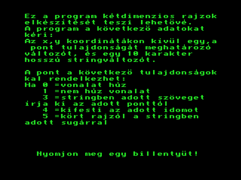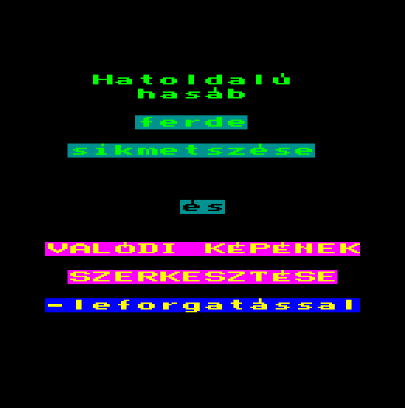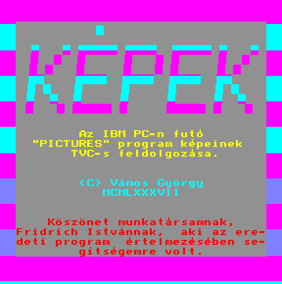 | Varázslat a képernyőn Készítette: Tasnádi Róbert (Cyprinus) (Szeged)(1990) Típus: Demo - Kép/Animáció Fájlok száma: 1 Letöltés: varazslat.zip Leírás: - |