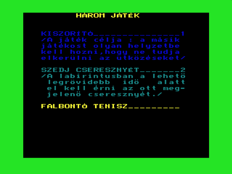 | 3 játék Készítette: (Nem ismert)(????) Típus: Játék - Ügyességi Fájlok száma: 1 Letöltés: 3jatek.zip Leírás: 2 játék van kész, egy kígyós és egy labirintusos |