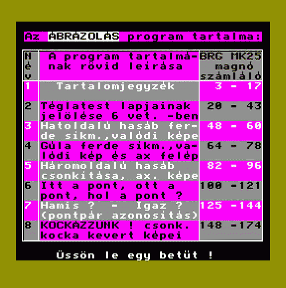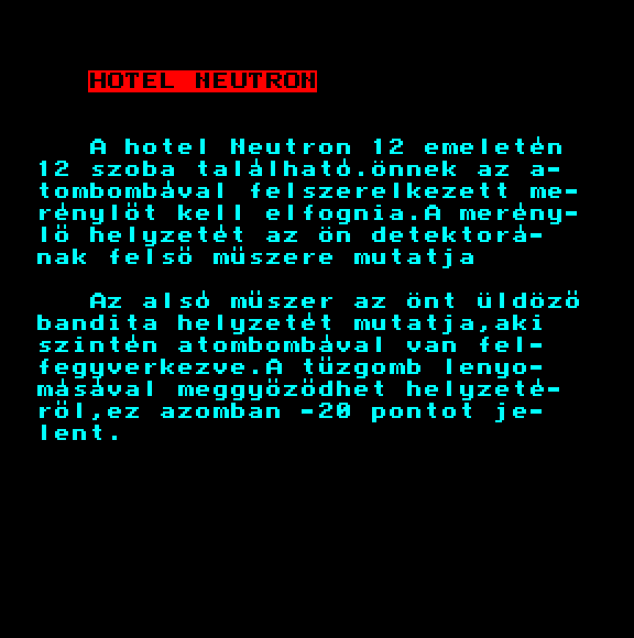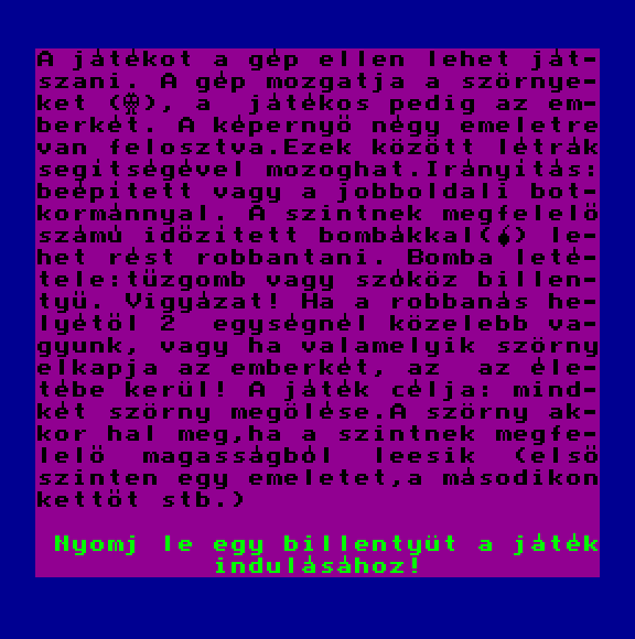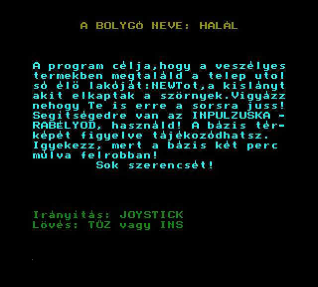 | A bolygó neve: Halál (f3) - magnós Készítette: Bertók Zsolt (Berysoft)(1988) Típus: Játék - Ügyességi Fájlok száma: 3 Letöltés: a_bolygo_neve_halal_magno.zip Leírás: - |