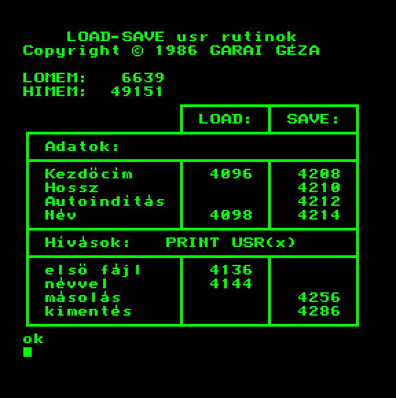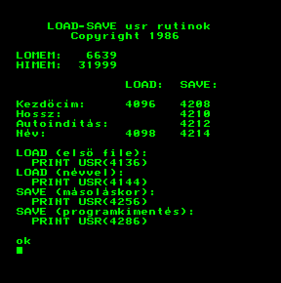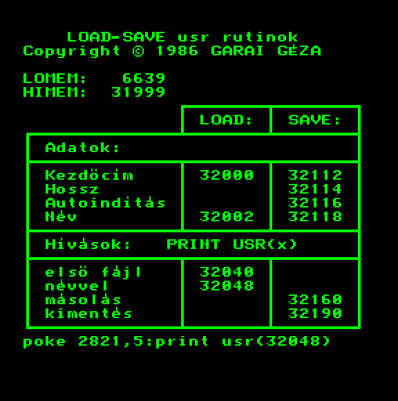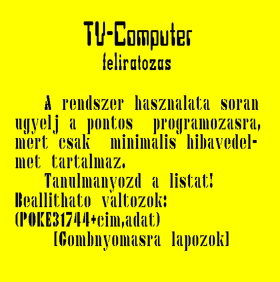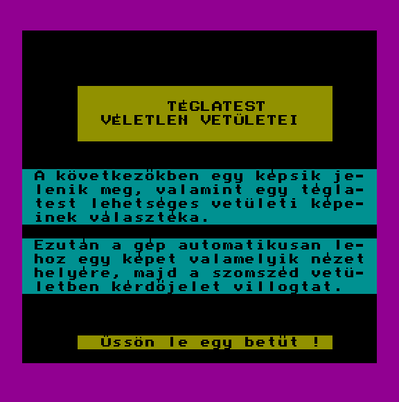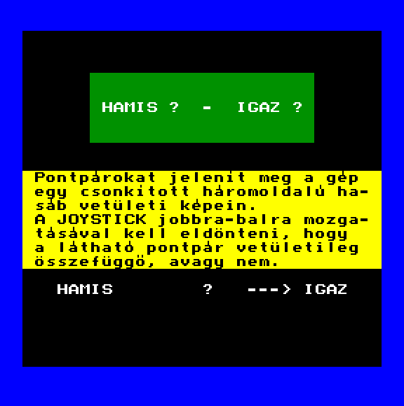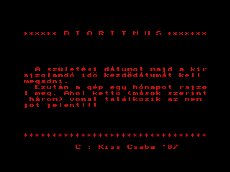 | Bioritmus (kazettán futó verzió) (f2) Készítette: Unisoft Gmk(1986) Típus: Oktató - Önismereti teszt Fájlok száma: 2 Letöltés: biortape.zip Leírás: Tekintsd meg bioritmusodat. Csak kazettán futó verzió. |