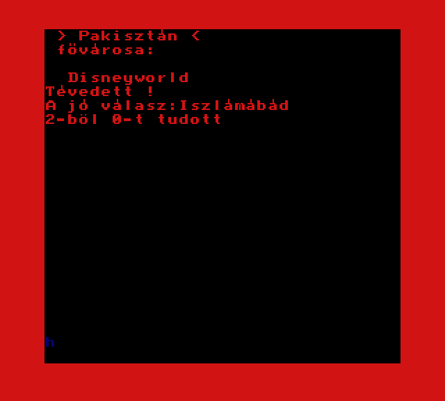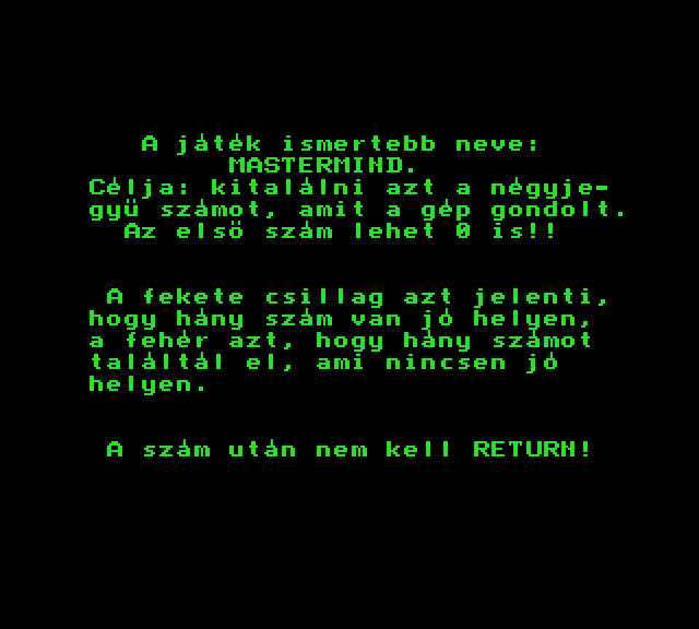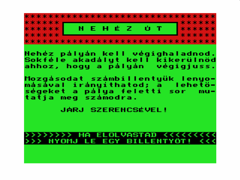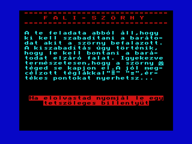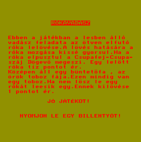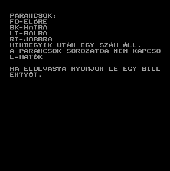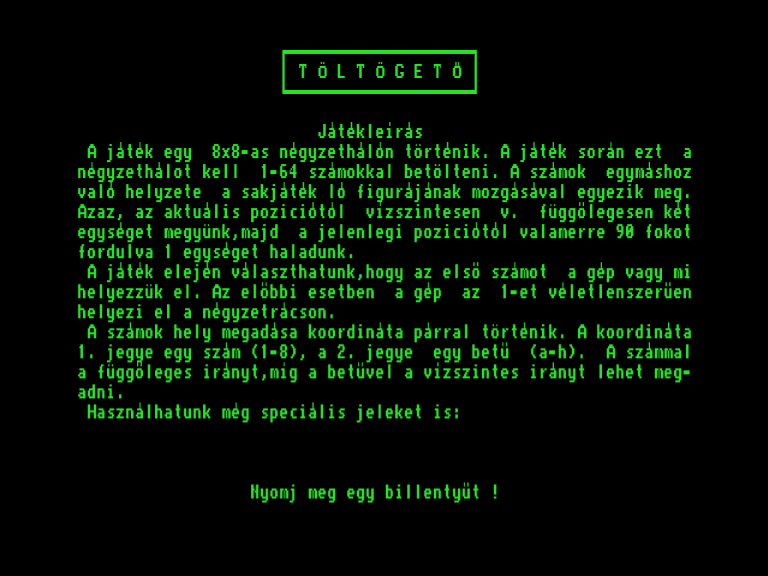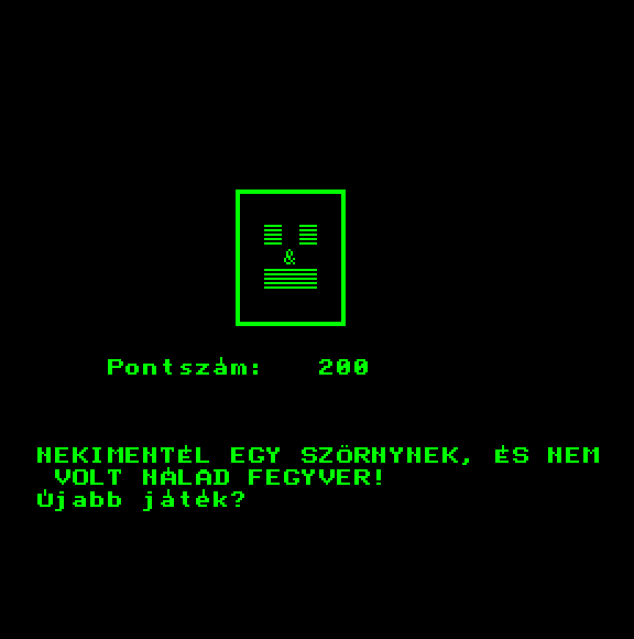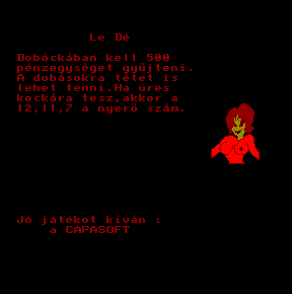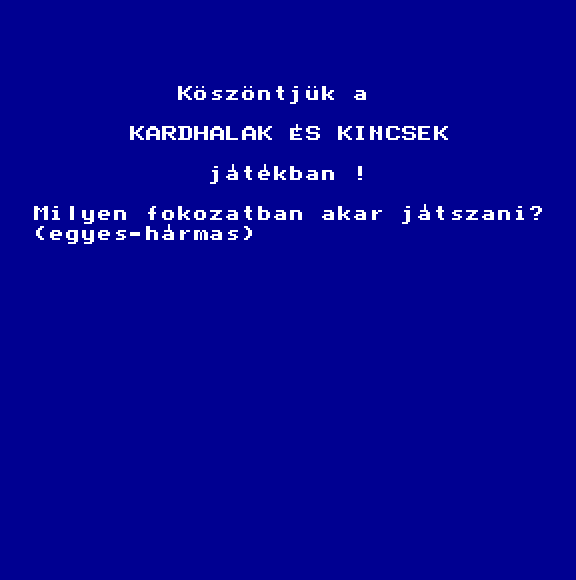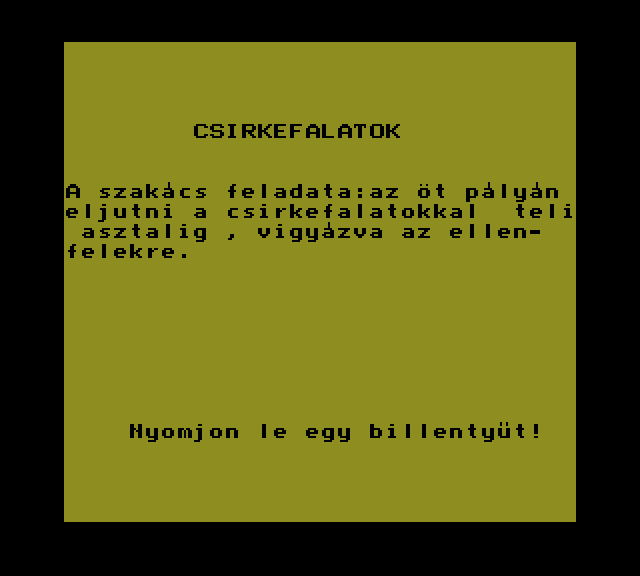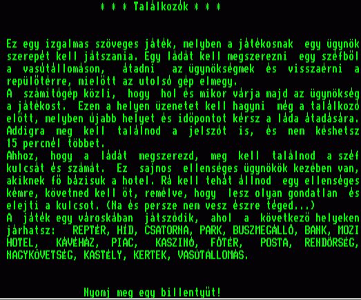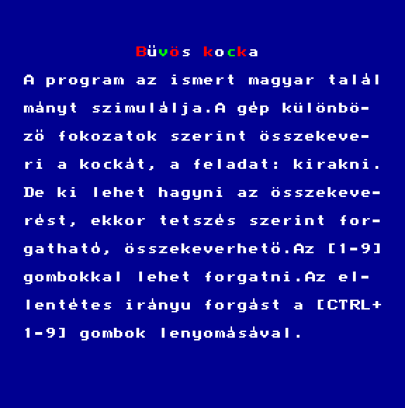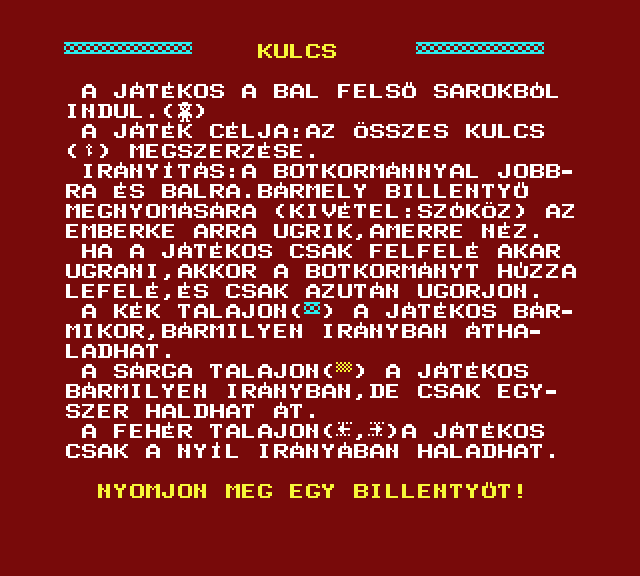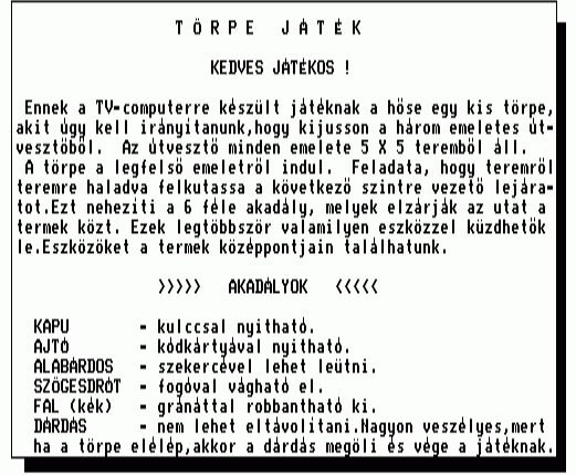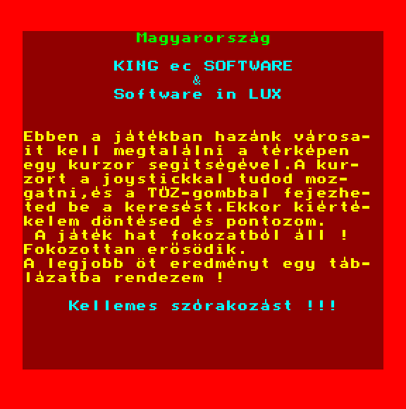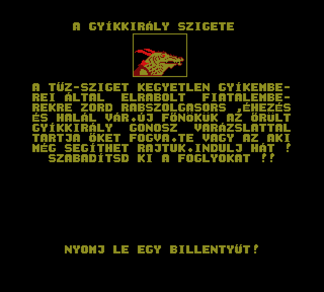 | A gyíkkirály (v2) Készítette: Agilar(1990) Típus: Játék - Szöveges kaland Fájlok száma: 1 Letöltés: agyikkiraly.zip Leírás: Választós kalandjáték, mint a korabeli lapozós könyvekben. |