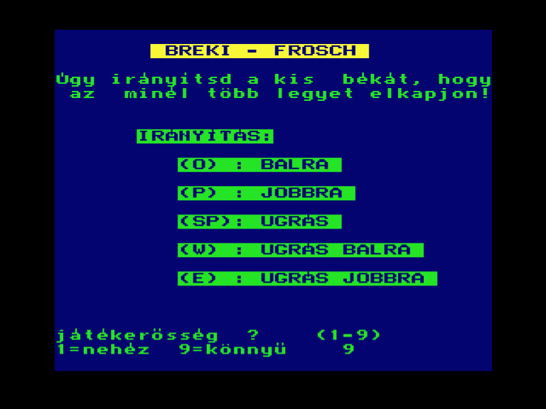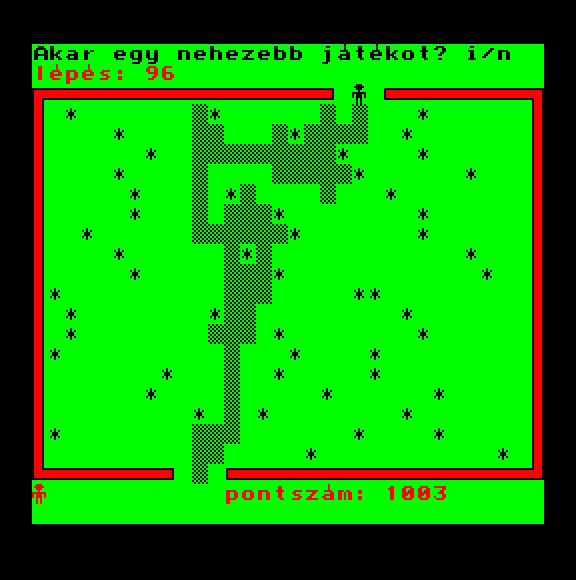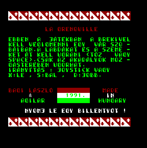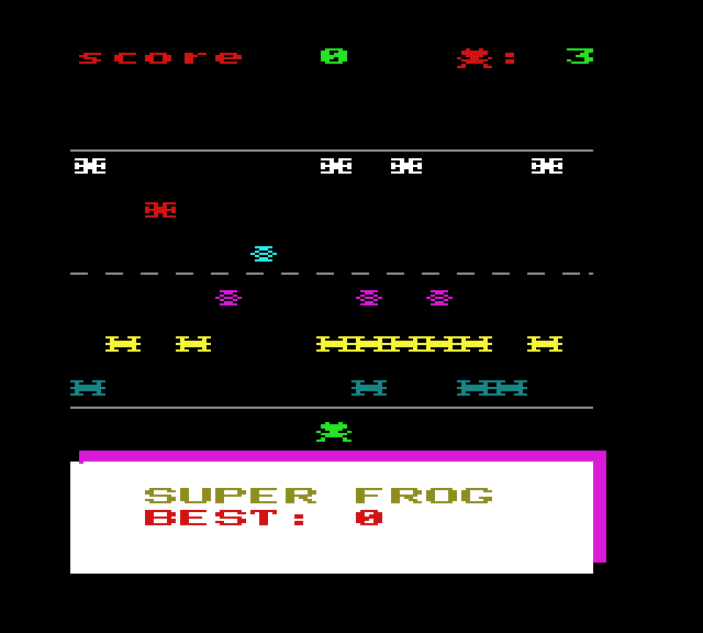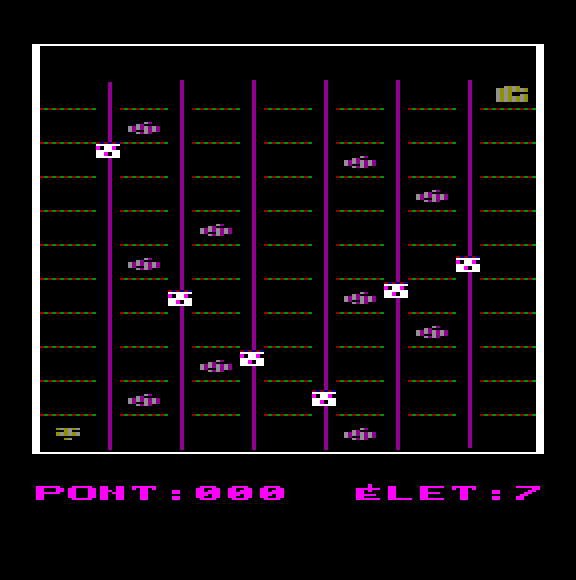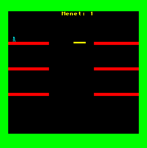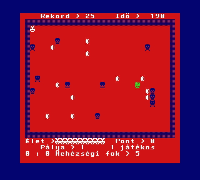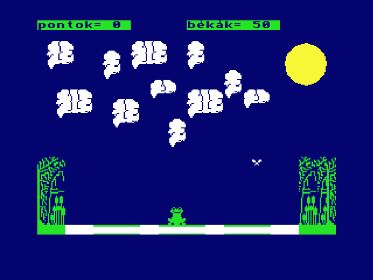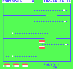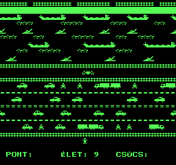| Átkelés Készítette: Juhász I.(????) Típus: Játék - Ügyességi - Frogger típusú Fájlok száma: 1 Letöltés: atkeles.zip Leírás: Klasszikus Frogger klón. |