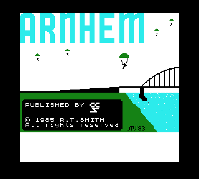 | Arnhem Készítette: Vindics Isván (STV)(1985) Típus: Játék - Stratégia Fájlok száma: 1 Letöltés: arnhem.zip Leírás: Klasszikus Spectrum stratégia konverziója. A 2. világháborús arnheimi csata lejátszása a cél |