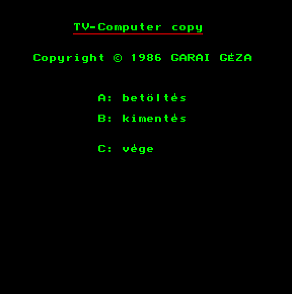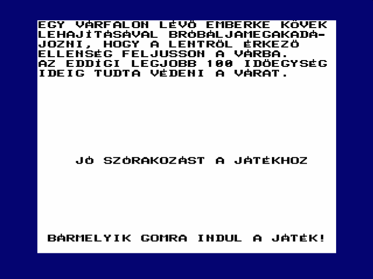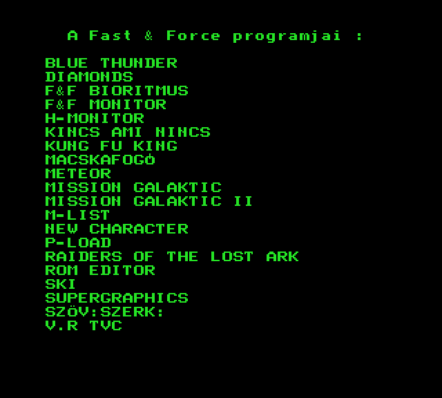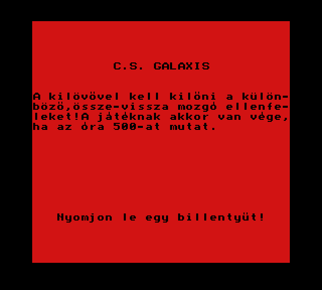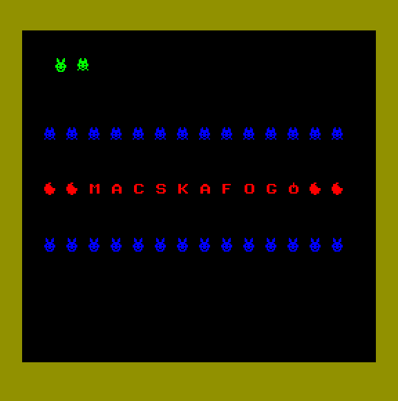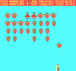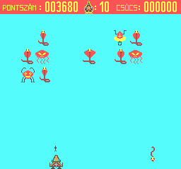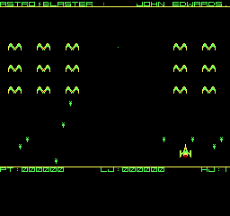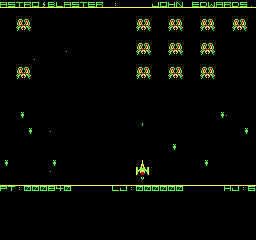 | Astro Blaster Készítette: Vindics Isván (STV)(1983) Típus: Játék - Ügyességi - Invaders típusú Fájlok száma: 1 Letöltés: astroblaster.zip Leírás: Klasszikus Invaders klón, először Spectrumról Primóra, majd onnan TVC-re konvertálva. |
