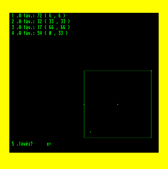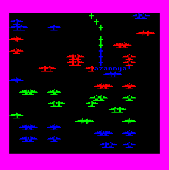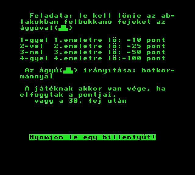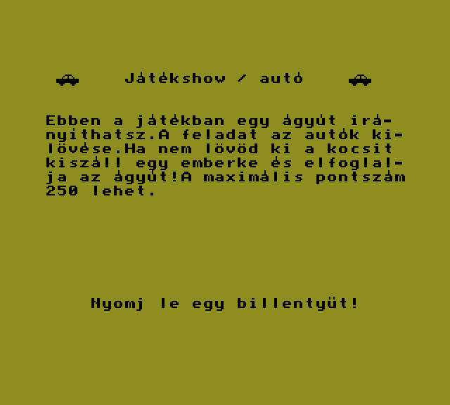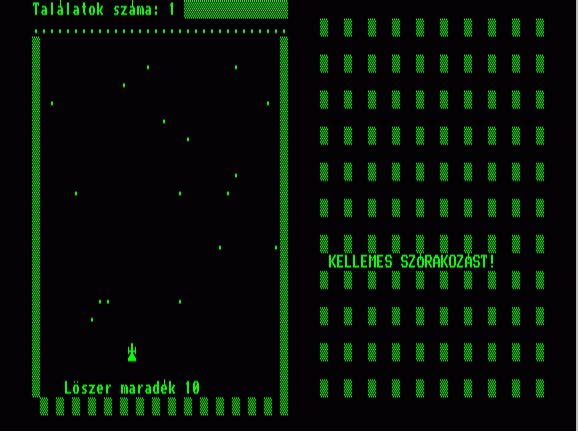 | Azannya! Készítette: nincs megjelölve szerző(????) Típus: Játék - Ügyességi - Le Mans típusú Fájlok száma: 1 Letöltés: azannya.zip Leírás: kerüld kia célkeresztel a gépéket, mert ha eltalálod, jön az azannya. |