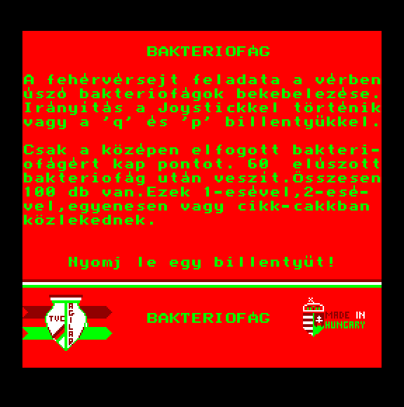 | Baktériumevő Készítette: (Nem ismert)(????) Típus: Játék Fájlok száma: 1 Letöltés: bakteriumevo.zip Leírás: - |
