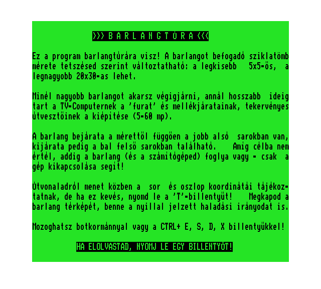 | Barlangtúra Készítette: Tasnádi Róbert (Cyprinus) (Szeged)(1988) Típus: Játék - Ügyességi - Labirintusos Fájlok száma: 1 Letöltés: barlangtura.zip Leírás: - |