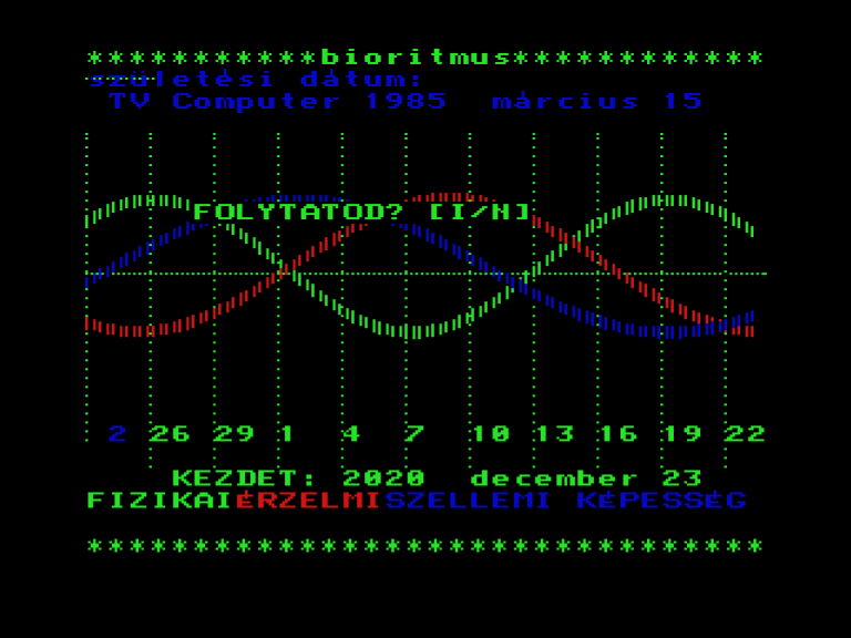 | Bioritmus (v1) Készítette: Unisoft Gmk(1986) Típus: Oktató - Önismereti teszt Fájlok száma: 1 Letöltés: bioritv1.zip Leírás: Tekintsd meg bioritmusodat. |