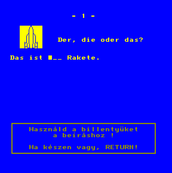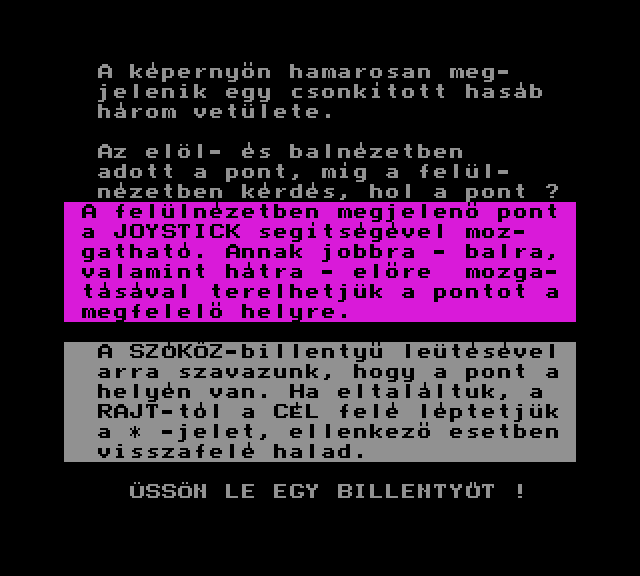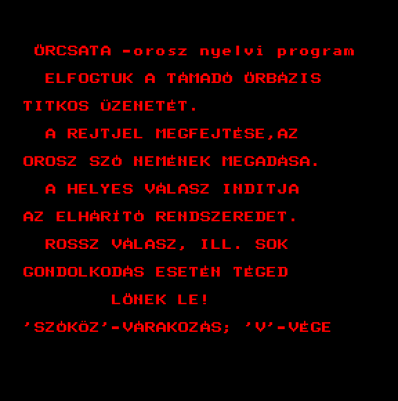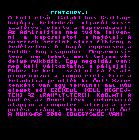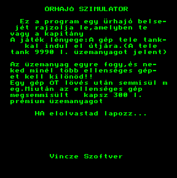 | Űrhajó szimulátor (64k+) Készítette: Vincze Szoftver(????) Típus: Játék - Szimuláció - Szimulátor Fájlok száma: 1 Letöltés: urhaszim.zip Leírás: ki kell lőnöd az X-eket :) Azok ellenséges űrhajók. :) |