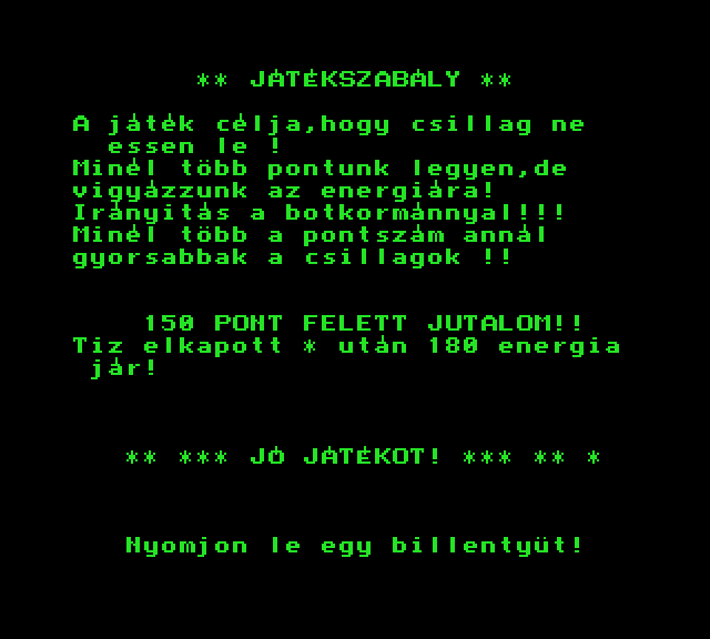 | Űrcsata (v2) Készítette: Black Star Software (Kókai László)(????) Típus: Játék - Ügyességi - Arkanoid típusú Fájlok száma: 1 Letöltés: urcsatav2.zip Leírás: - |
