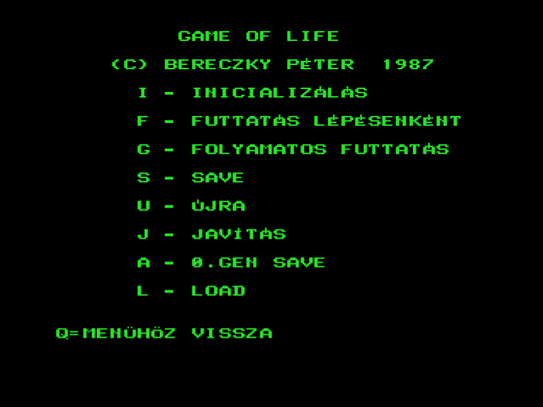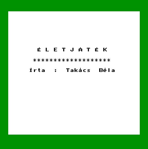 | Életjáték Készítette: Takács Béla(????) Típus: Oktató - Életjáték Fájlok száma: 1 Letöltés: eletjatek.zip Leírás: Ha egy mezőnek két szomszédja van él, ha egy öresnek 3 akkor uj szuletik, ha 4 akkor kihal? vmi ilyesmi a szabály. |