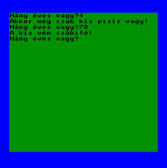 | Életkorod? Készítette: (Nem ismert)(????) Típus: Játék Fájlok száma: 1 Letöltés: eletkoro.zip Leírás: gagyi program, ha nagy számot írsz leöregez, egyéként meg lefiatalaoz |