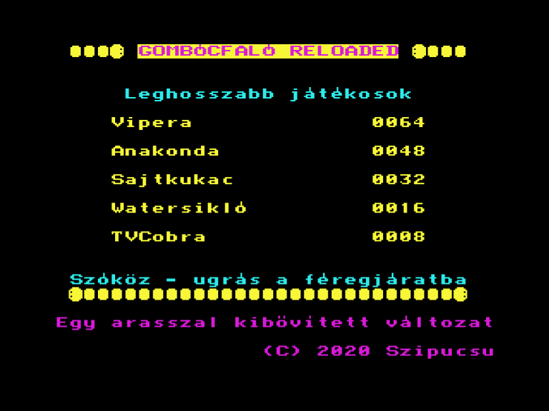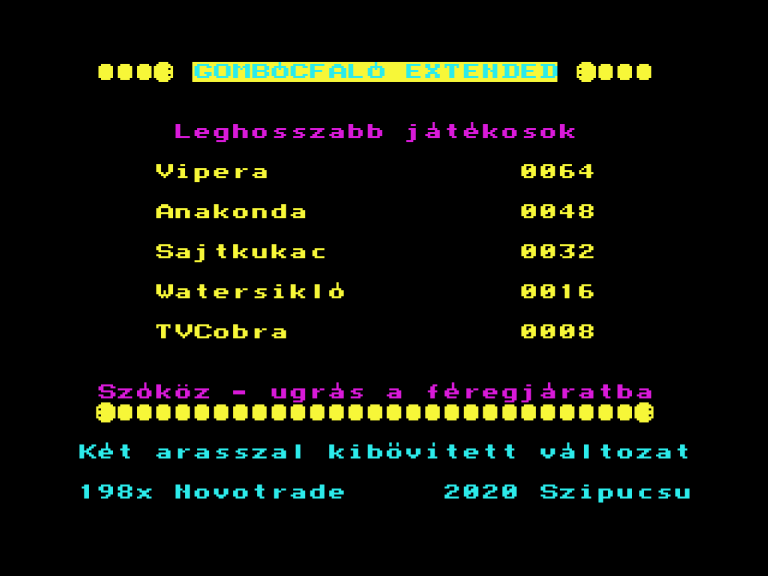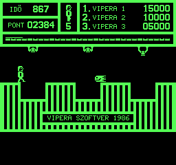 | Vipera Készítette: Lénárt Attila (Atlas)(1987) Típus: Játék - Ügyességi - Kígyós Fájlok száma: 1 Letöltés: vipera.zip Leírás: A szokásos kígyós járék egy újabb megvalkósítása. |