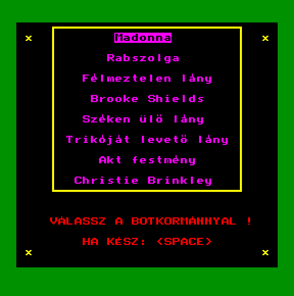 | A TVC 2. szexoktató programja (aka. Sexshow) (f17) Készítette: Buddha Softhouse(1988) Típus: Oktató - Szex Fájlok száma: 17 Letöltés: sexshow.zip Leírás: újabb képek, screenshotnak itt oldal egy konszolidált. :) |