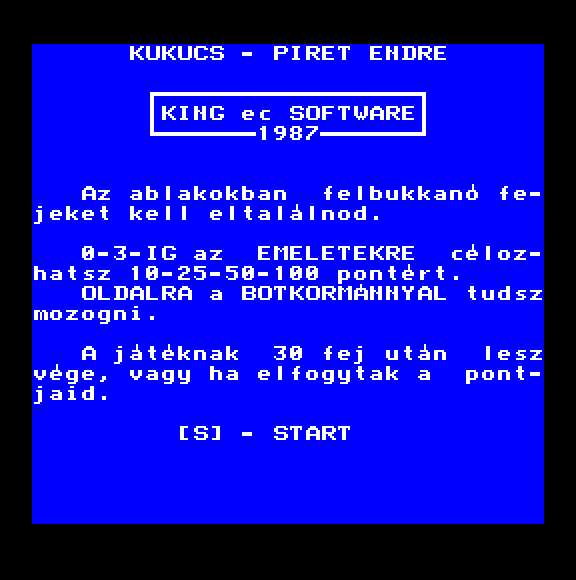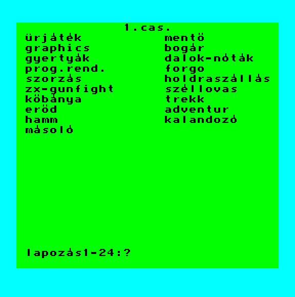 | A zsaru Készítette: Bagi László (Cápasoft)(1990) Típus: Játék - Ügyességi Fájlok száma: 1 Letöltés: azsaru.zip Leírás: - |