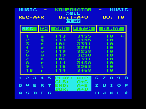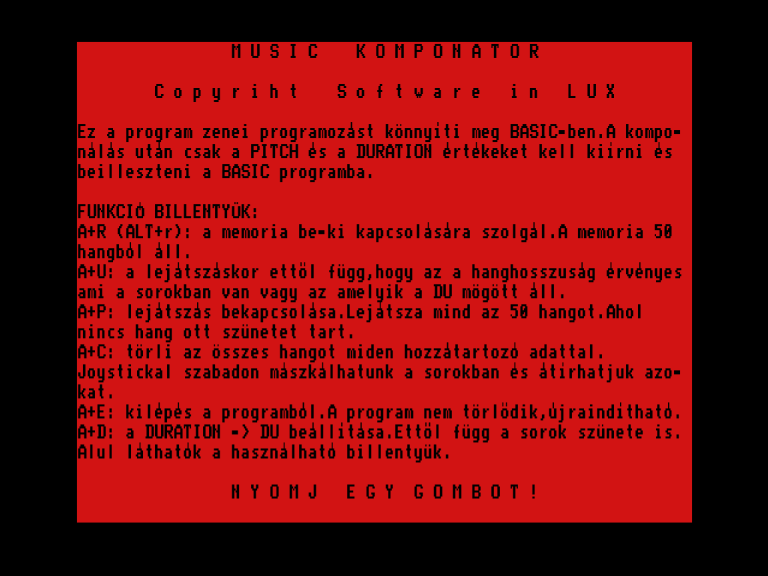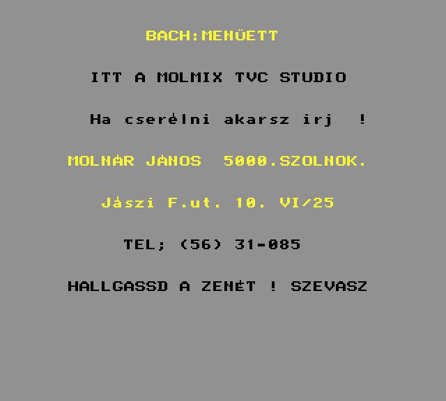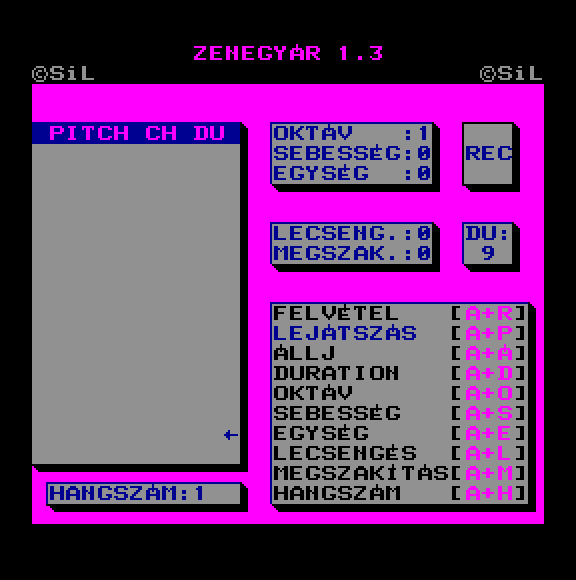 | Zenebona Készítette: 'a' studio(1986) Típus: Felhasználói - Zene/Hang Fájlok száma: 1 Letöltés: zenebona.zip Leírás: zeneszerkesztő, kotta alapján |