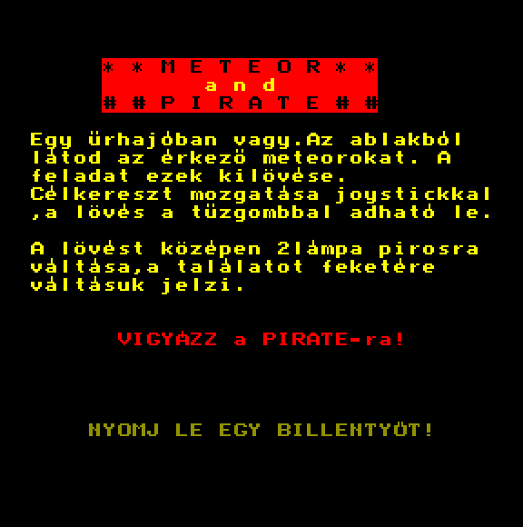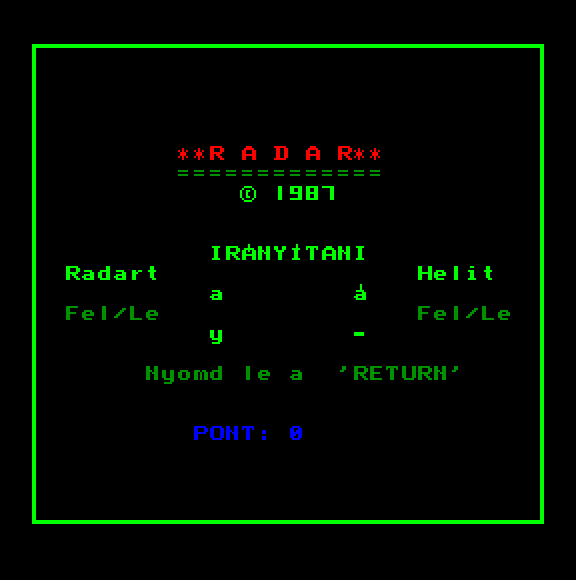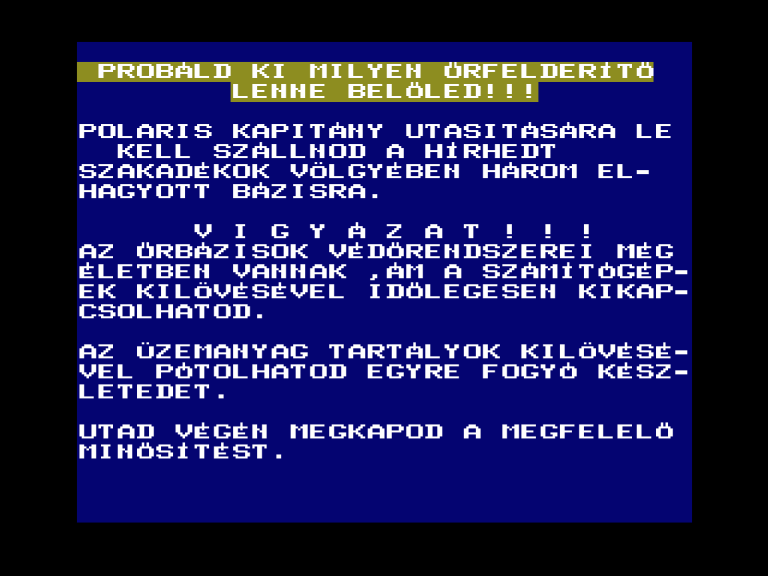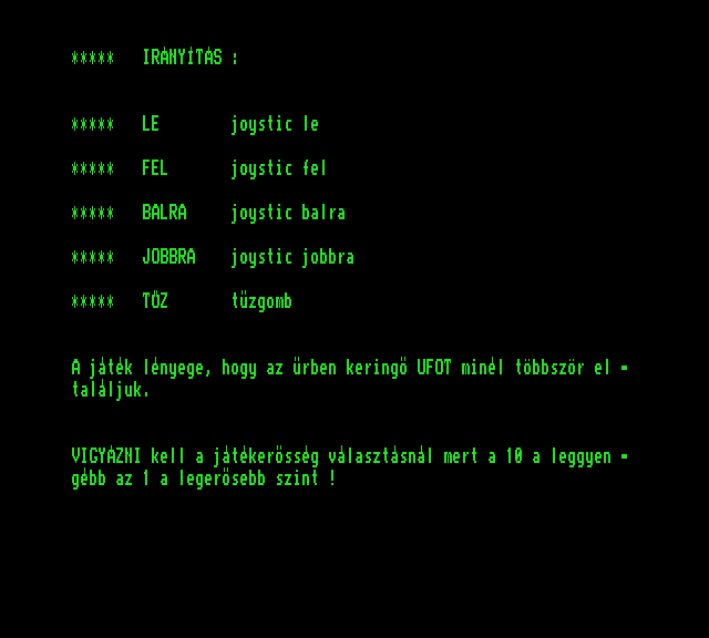 | Őrjárat (ferltört) Készítette: Takács Béla(????) Típus: Játék - Ügyességi - Lövöldözős Fájlok száma: 1 Letöltés: orjarat.zip Leírás: A kis repcsivel röpdösni, és öldökölni kell. |