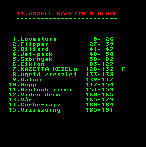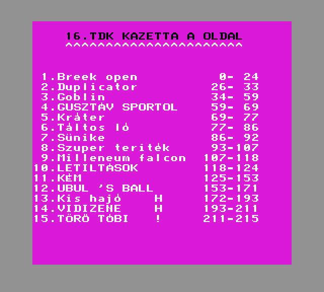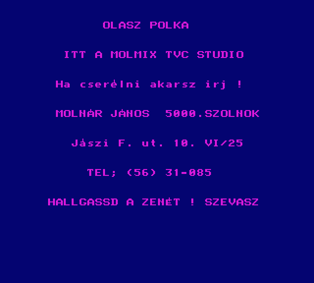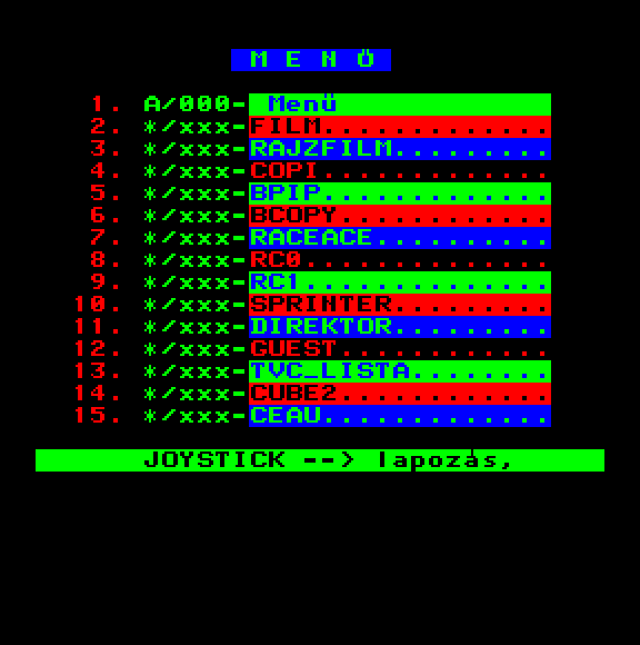 | Zene-Zene-Zene (aka. Zenék) (v1) (eredeti kazettás verzió - 8 Játék) Készítette: (Nem ismert)(????) Típus: Demo - Zenei/Hang Fájlok száma: 1 Letöltés: zeneev.zip Leírás: Jópár klasszikus szám. |