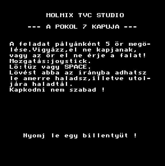 | A pokol 7 kapuja Készítette: Molnár János (Molmix)(????) Típus: Játék - Ügyességi - Lövöldözős Fájlok száma: 1 Letöltés: pokol7.zip Leírás: lődd ki a koponyákat... |