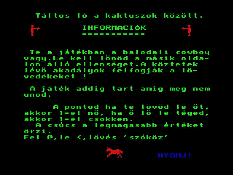 | Vadnyugat Készítette: Pőcze Szabolcs(1987) Típus: Játék - Ügyességi - Egylövéses Fájlok száma: 1 Letöltés: vadnyugat.zip Leírás: Lődd ki az abalkban tanyázó ellent. |