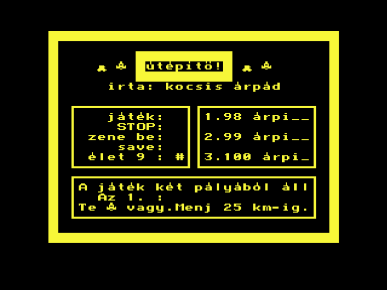 | Útépítő Készítette: Kocsis Árpád (TVCM)(????) Típus: Játék Fájlok száma: 1 Letöltés: utepito.zip Leírás: - |