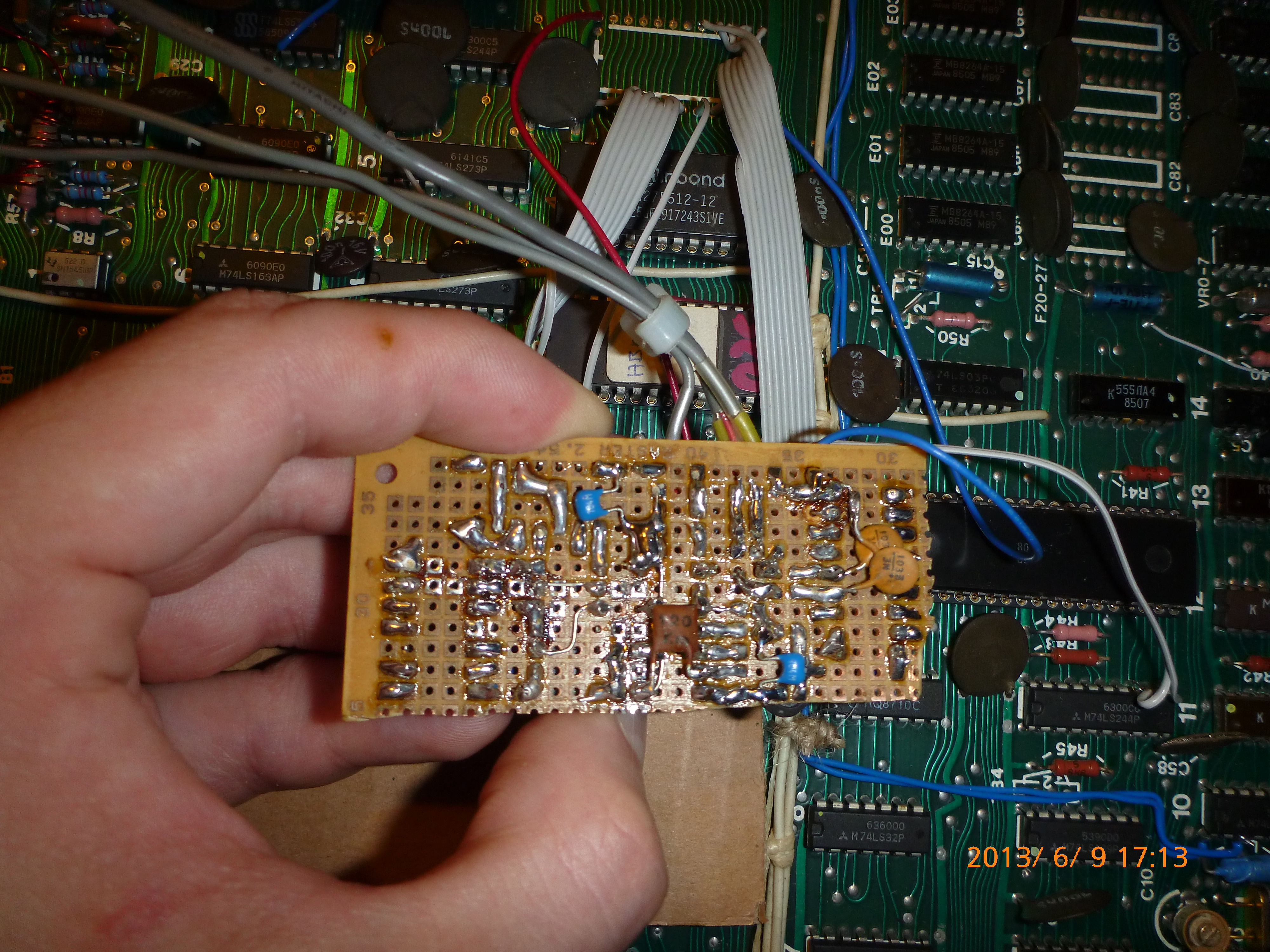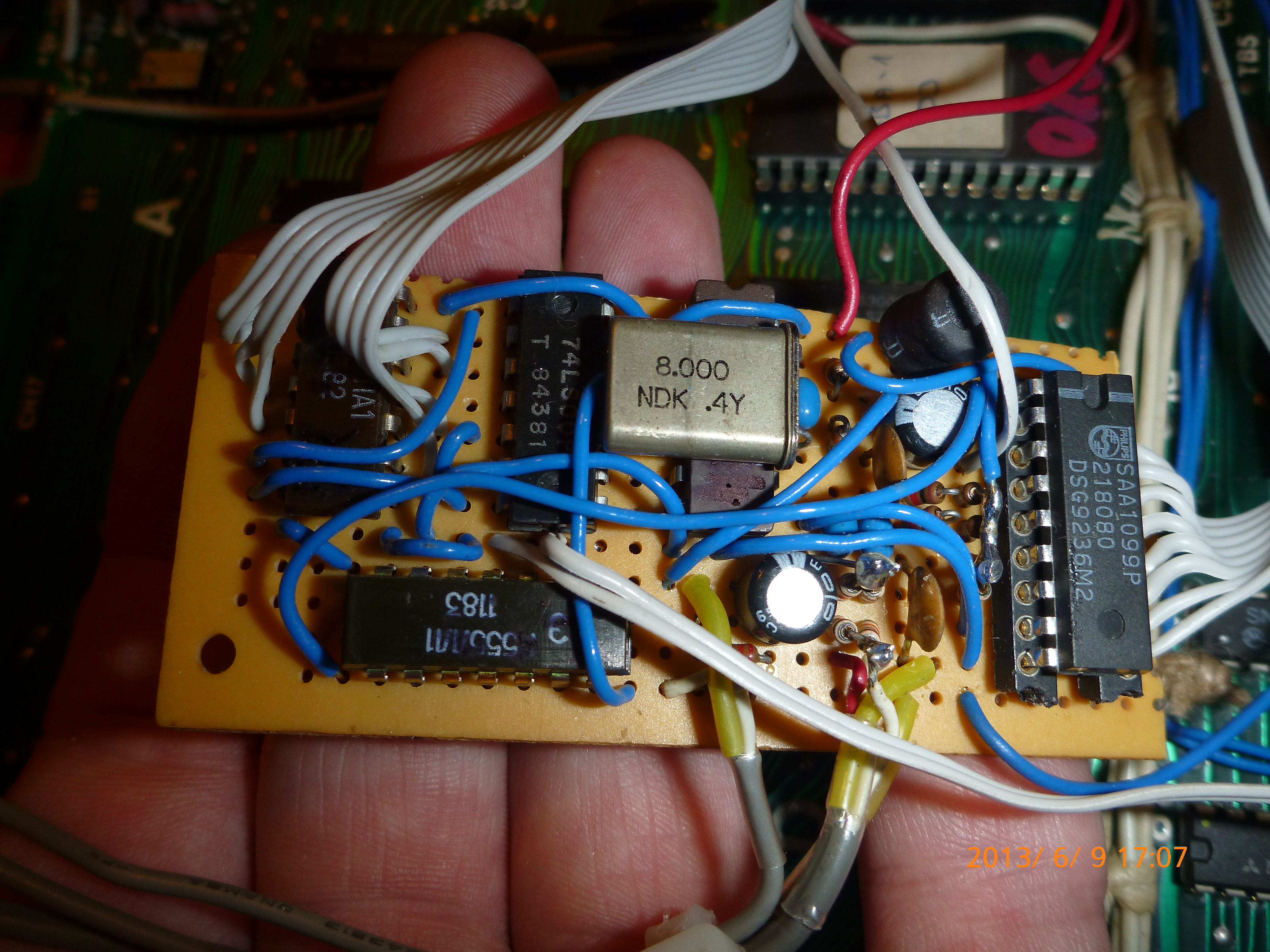 Ez a pár kapuáramkör és az SAA elfér egy pici próbanyákon, amit a nyomtatóport mögé a burkolat alatt el lehet helyezni. A bekötés a TVC D5-ös pozíciójú