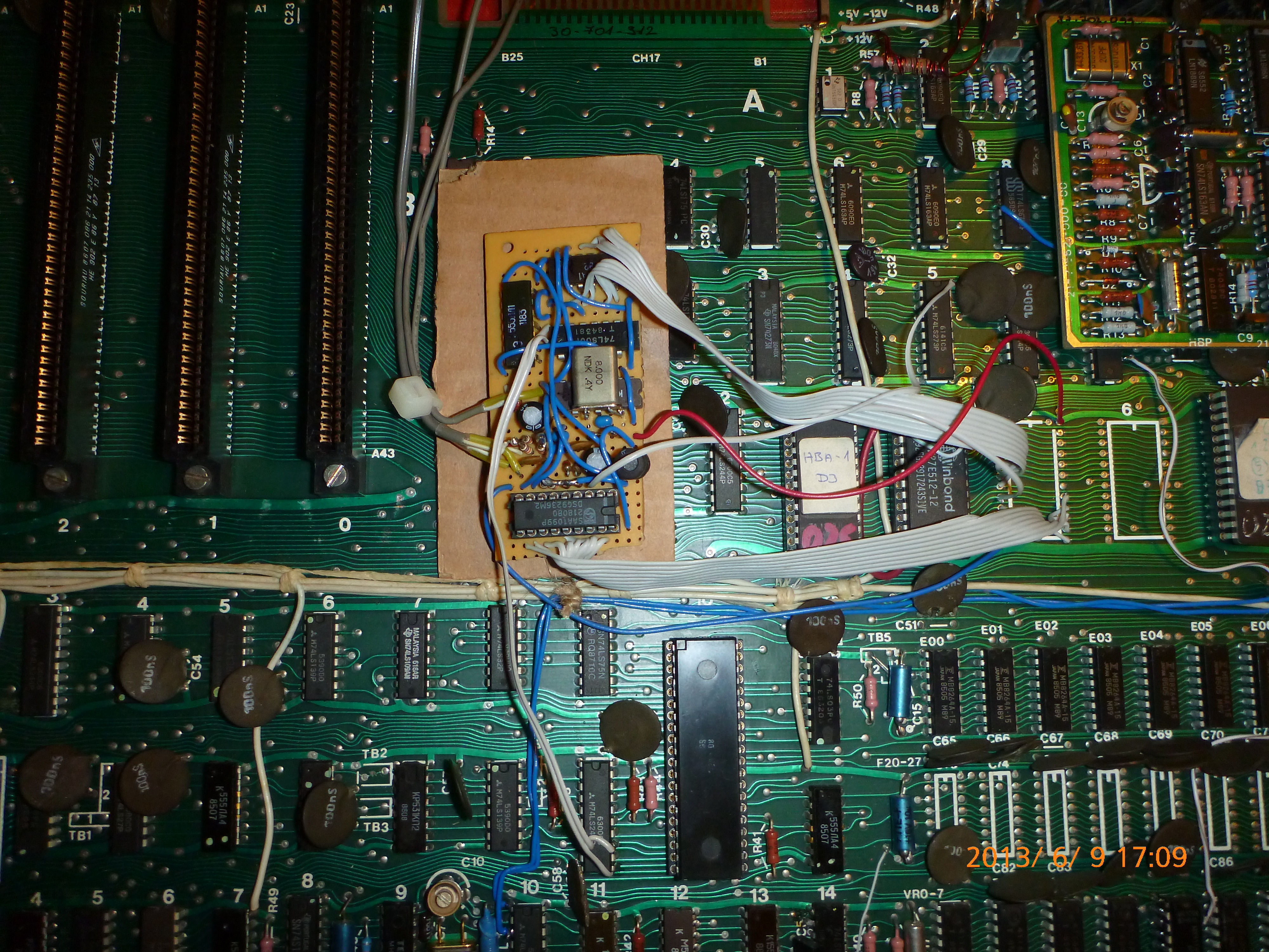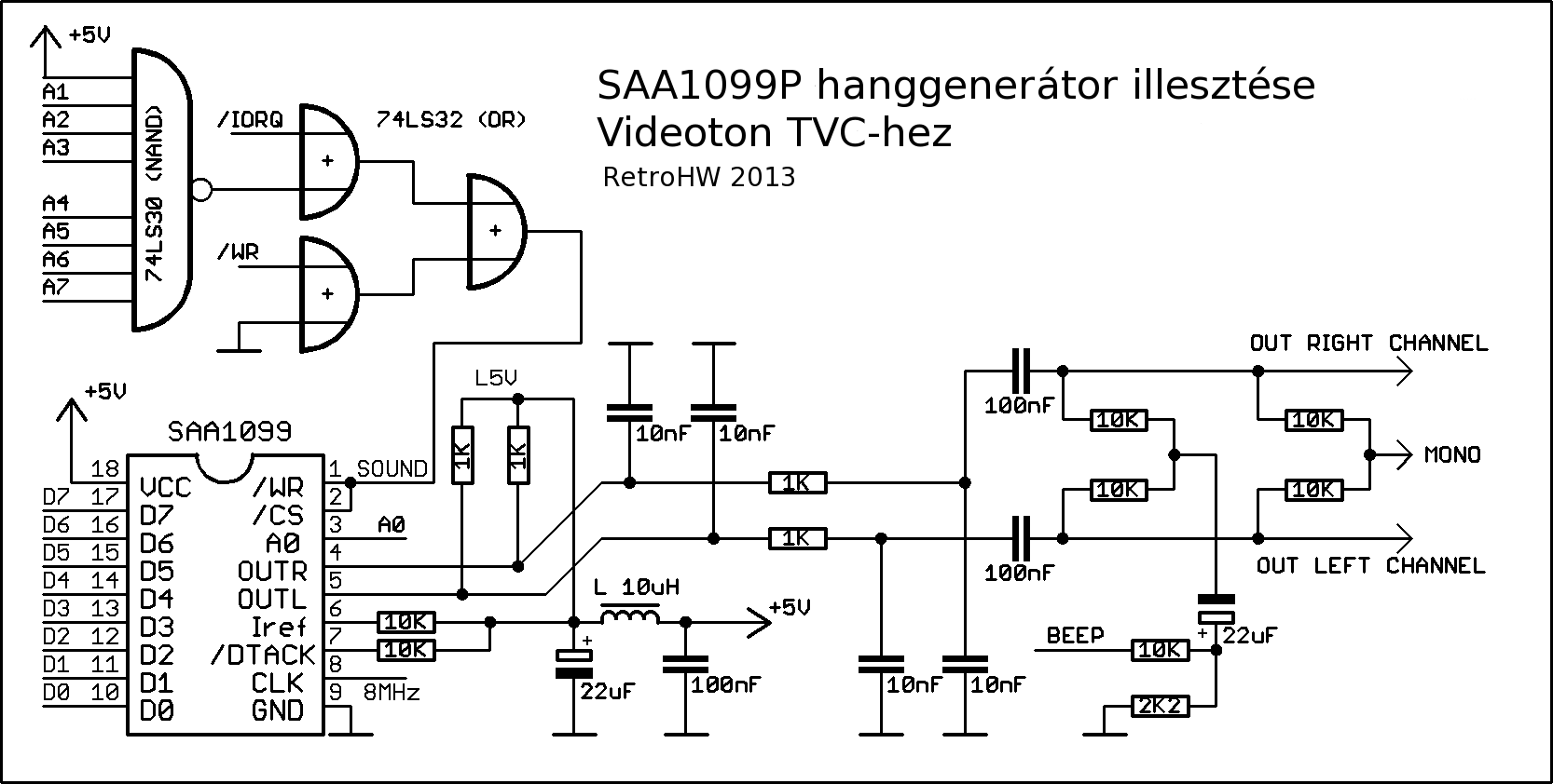 A kapcsolás nagyon egyszerű, az áramkör a TVC FFh(regcím) és FEh(adat) portjaira van biggyesztve, a címdekódolást egy 74LS30 8 bemenetű NAND kapu végzi, amit összekapuzunk