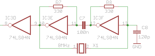 Szükség van továbbá egy 8MHz-es oszcillátorra is, amit egy 74LS04 hex inverter 3 kapujából készítünk.