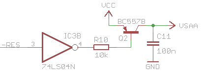 Ennek az IC-nek a maradék kapuiból elkészíthetjük az SAA RESET-jét, ami mindössze annyit csinál, hogy a TVC RESET gombjának megnyomásakor