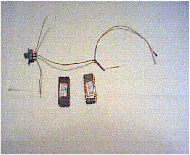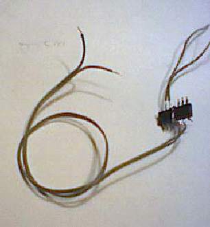 Az előkészítés menete: a 7-es, és 14-es lábak kivételével a többit jobbra-balra széthajtogatjuk (kiterítjük). A 4-es, és 11-es lábakat az IC tetején át teljesen visszahajtjuk és egymással összeforrasztjuk. A 12-es, és 13-as lábakra kb. 6 cm-es vezetékeket forrasztunk, az 5-ös, és 6-os lábakra pedig kb. 20 cm-es vezetékeket. Az 5,6 lábak teljesen egyformák logikailag, ezért az általam használt vezeték (PC floppy szalagkábel két vezetéke) csak a végein van kettéválasztva, és különösebben nincs erenként megkülönböztetve. (Az IC több kaput tartalmaz, mint amire szükség van, más jó bekötés is lehetséges, de ha a gyári kapcsolást építjük utána, akkor nem kell katalógusokkal vacakolni, ezért lett pont így. A TTL IC-k bemenete gyárilag magas logikai szintre áll be, ezért nem szükséges a nem használt bemeneteket sehova sem kötni. Tulajdonképpen a nem használt IC lábak akár tőből le is vághatók. A 7-es és 14-es kell, azok maradjanak!)