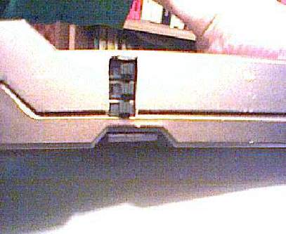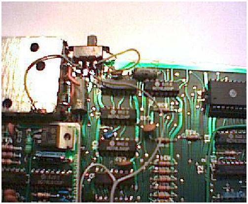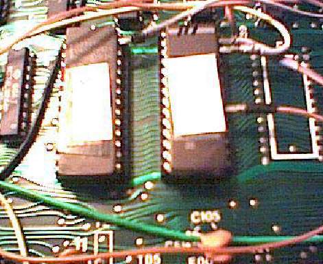 A kapcsoló két-szélső kontaktusára kb. 6-6 cm-es vezeték darabot célszerű forrasztani, a középső (közös) pontra kb. 20 cm-es vezetékdarab kell, a kapcsoló végleges helyétől a D3-as, és a D7-es IC-k 27, illetve 26-os pontjáig kell, hogy kényelmesen elérjen. Ezeken a pontokon a kábelre fel kell forrasztani a "precidip" foglalatlábat, és szigetelni zsugorcsővel, vagy szigetelő szalaggal. A következő képen látszik az előkészített kapcsoló, és a két EPROM. A fotók rossz minőségéért elnézést kérek, web-kamerával készültek.