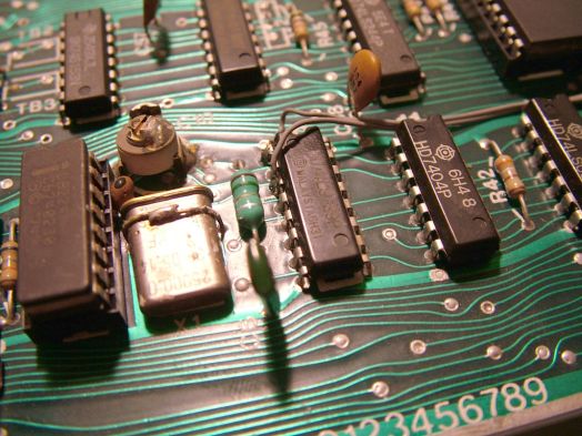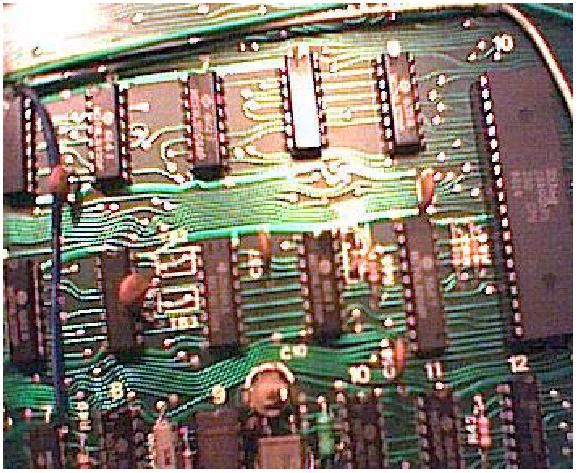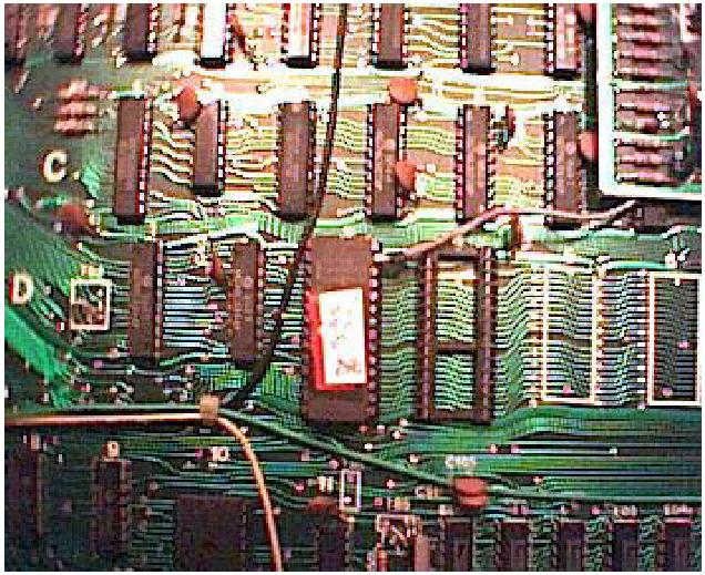 Az előkészített IC-t rögzítenünk kell , és tápfeszültséggel kell ellátnunk. Mindkét feladatot megoldjuk, ha az IC-t az alaplapon a célhoz közel lévő, 7-es, és 14-es lábon táplált IC-re felforrasztjuk. A közelben, forrasztópákával viszonylag jól megközelíthetően a D11-es IC felel meg nekünk, tehát ennek a hátára kell ráfektetni az előkészített extra IC-nket, és a két IC 7-7, valamint a 14-14 lábait egymáshoz kell forrasztanunk.