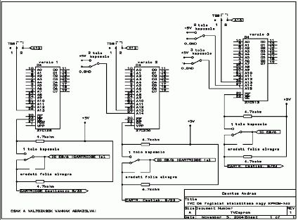 Itt a /B kapcsoló a bináris összeadásra állítja a programot, a jatek.32k név helyett az összeadni kívánt program neve legyen, a jatek.128 helyett a végeredmény file nevét kell írni. Tulajdonképpen csak helyet tölt ki a 3 db plusz egyforma játék, de így egyszerűbb helyet foglalnunk, mint "szövegszerkesztenünk" 12kB hexa FF adatot. Ha megvannak a 16kB-os állományaink, akkor a fentiek szerint összeadva őket (COPY /B 1_jatek.128+2_jatek.128+3_jatek.128+4_jatek.128 eredmeny.512) kapunk egy pontosan EPROM kapacitás méretű állományt. Ezt kell beégettetni. A fentiek szerint amikor mindkét (A14, A15) címvezetékre 0-van kapcsolva akkor az 1_jatek.128 anyag lesz kiválasztva. Ha A14-re +5V, A15-re 0V kapcsolódik, akkor a 2_jatek.128-cal játszhatunk. Ha A14-re 0, és A15-re +5V kapcsolódik, akkor a 3_jatek.128 az eredmény, és ha mindkét bemenet +5V-ra kötődik, akkor a negyedik helyre beégetett cartridge programmal fog jelentkezni a TVC.