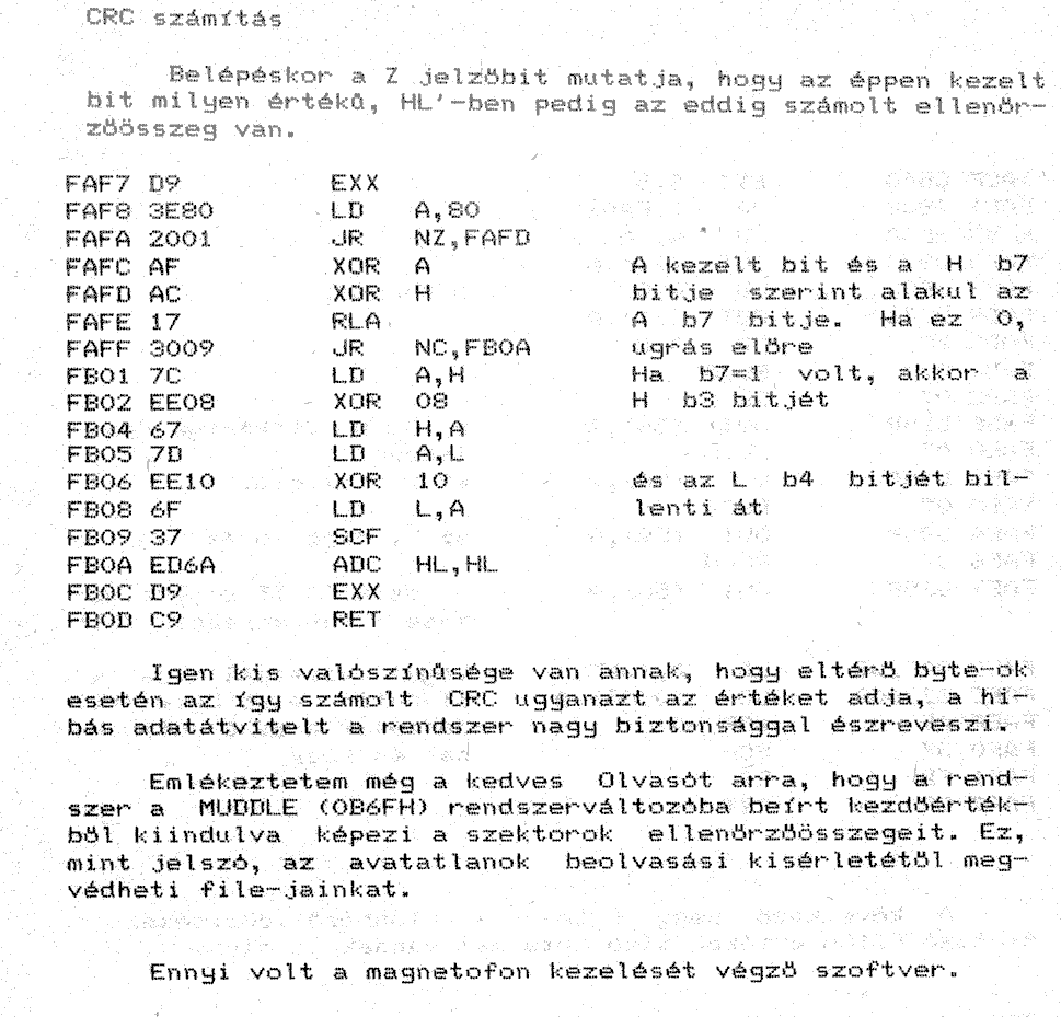 bájt. A CRC számítás algoritmusa nem egyszerű ellenőrző összeg, annál azért bonyolultabb. A CRC számítása a tömb első szektora esetén a szinkronbájttól ($6A) a filendmark bájtig történik (a határokat is beleértve), a többi szektor esetén a sectorcounter bájttól filendmark bájtig (a határokat is beleértve). (A CRC számoló rutin itt található.) | |