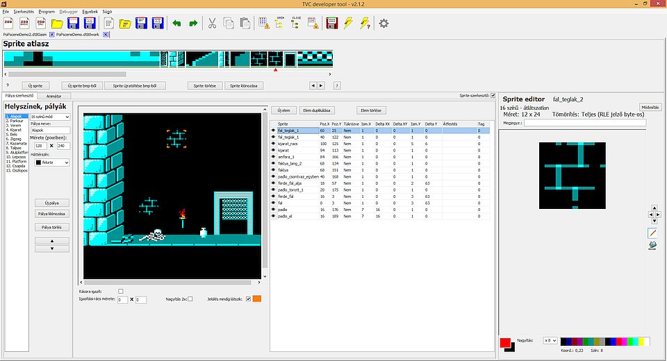 Asm fordító, C fordító, sprite szerkesztő, pálya editor és még egy egyszerű zeneszerkesztő is.